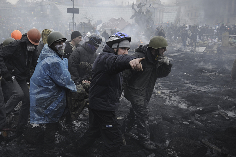 На фото: раненный в боях с милицией сторонник Евромайдана, 20 февраля22 февраля после декриминализации уголовной статьи «О превышении власти», по которой экс-премьера Украины Юлию Тимошенко в 2011 году осудили на семь лет тюрьмы, лидер «Батькивщины» выходит на свободу. Из Харькова Тимошенко сразу отправилась на киевский Майдан, где выступила перед многотысячной толпой.