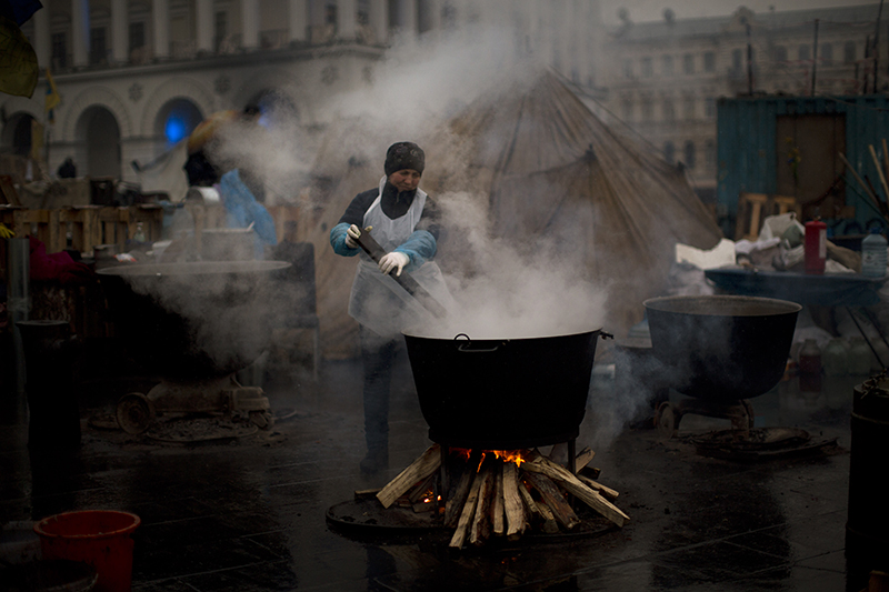 На фото: женщина готовит еду в палаточном городке, 3 марта.Бывший глава ЮКОСа Михаил Ходорковский в ночь на 9 марта посетил Майдан, где выступил перед собравшимися. Он сказал, что в России «есть люди, для которых дружба между российским и украинским народом важнее собственной свободы».