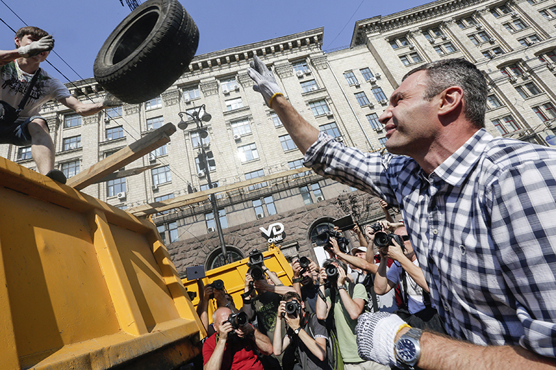 На фото: Кличко участвует в разборе баррикад в центре Киева, 9 августа. Сотрудники коммунальных служб приводят в порядок центр Киева перед проведением парада в честь Дня Независимости, 20 августа.