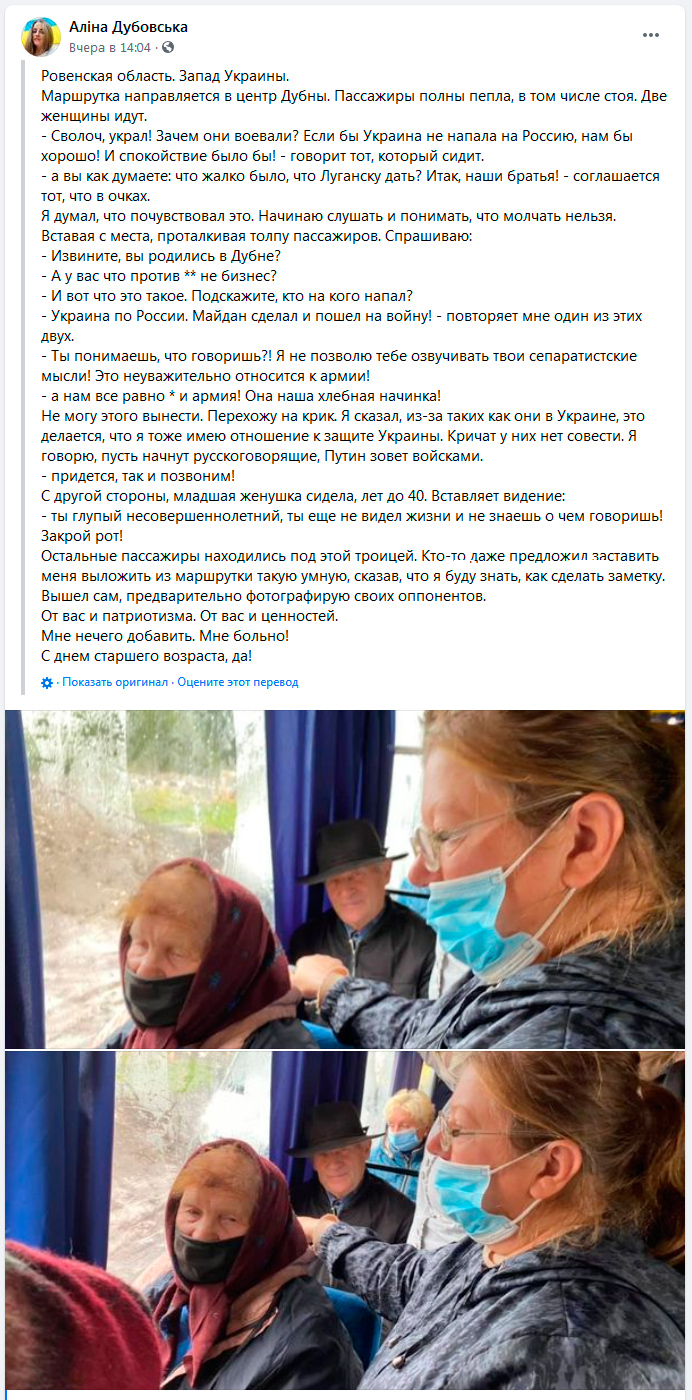 Ровенская журналистка Алина Дубовская, известная своими "патриотическими взглядами" и активной поддержкой армии, опубликовала пост, который произвел эффект разорвавшейся бомбы, собрав массу репостов и всю гамму фейсбучных лайков. Она подробно описала в нем скандал в городской маршрутке западноукраинского города Дубно, который ярко иллюстрируют позиции простых украинских граждан на седьмой год после победы Евромайдана.