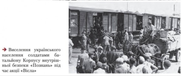 Перед вами два фото. Вверху: фото из учебника «История Украины для 11-го класса» 2019 года издания. К фото идет подпись — выселение украинского населения из Польши во время операции «Висла».