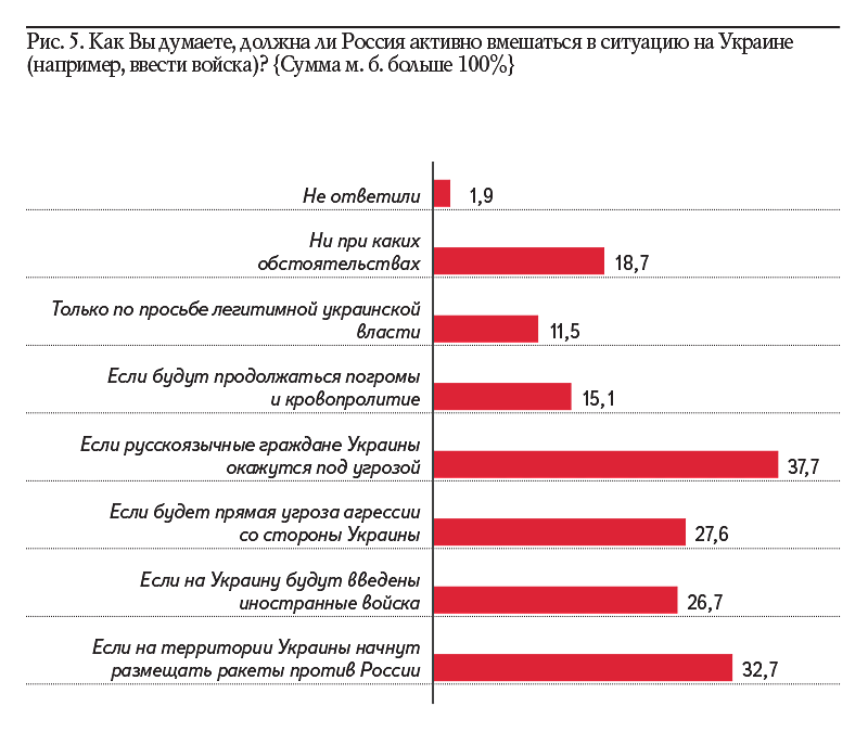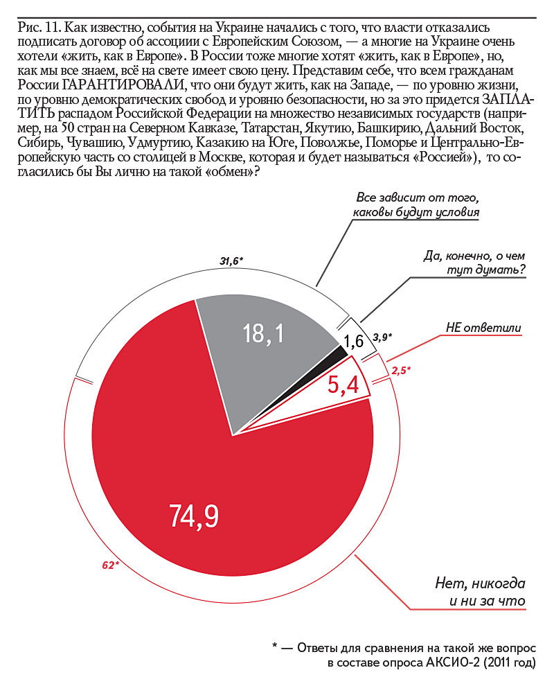 Опрос проведен 23–27 февраля 2014 г. Опрос проводили 1356 человек. Опрошено 25152 человека из всех 83 субъектов Российской Федерации и 11 зарубежных стран. Выборка математическими методами «отремонтирована» по полу, возрасту и уровню образования, и соответствует по этим параметрам генеральной совокупности — населению Российской Федерации старше 15 лет.