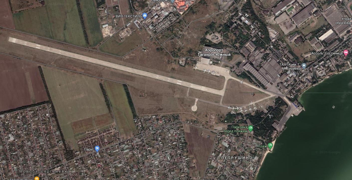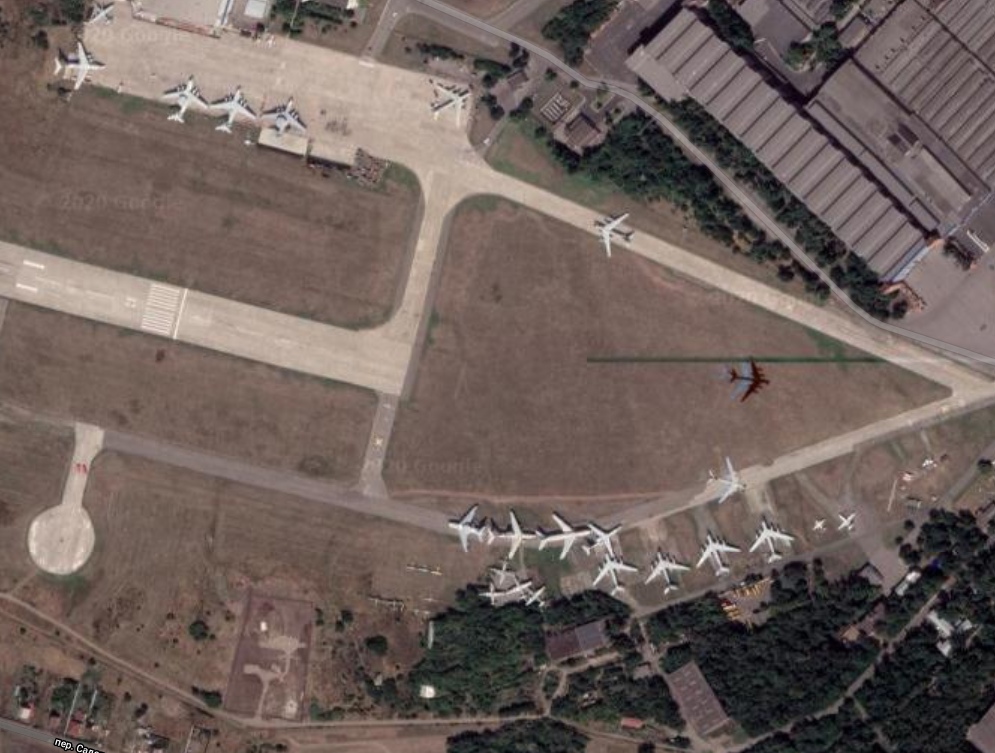 Ниже видим зоны стоянки самолётов. И даже взлетающий Туполев.(95 или 142) - самолёт с тенью под ним.