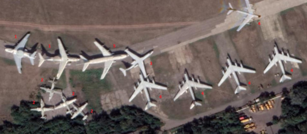 2,3,4 Самолёты ДРЛОиУ. Вполне возможно тут и А-50 и А-100. ИМХО размеры обтекателя РЛС у 2 и 4 самолёта разные. На 3 - есть основание для установки антенны.
