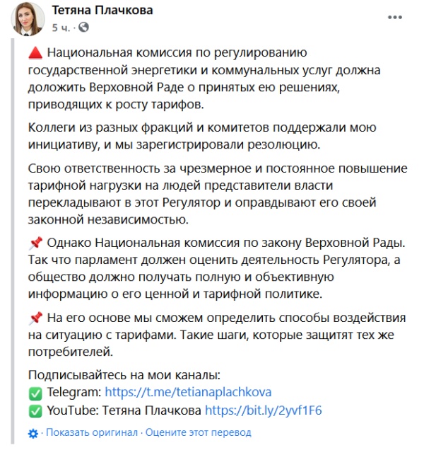 Как подчеркнула нардеп, свою ответственность за чрезмерное и постоянное увеличение тарифной нагрузки на людей представители власти переводят именно на этого регулятора и обосновывают это его юридической независимостью. Однако Нацкомиссия по закону подотчетна Верховной Раде. Поэтому парламент должен дать оценку деятельности регулятора, а общество — получить полную и объективную информацию о его ценовой и тарифной политике.