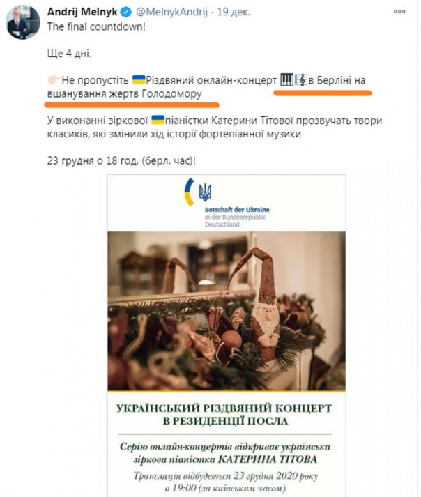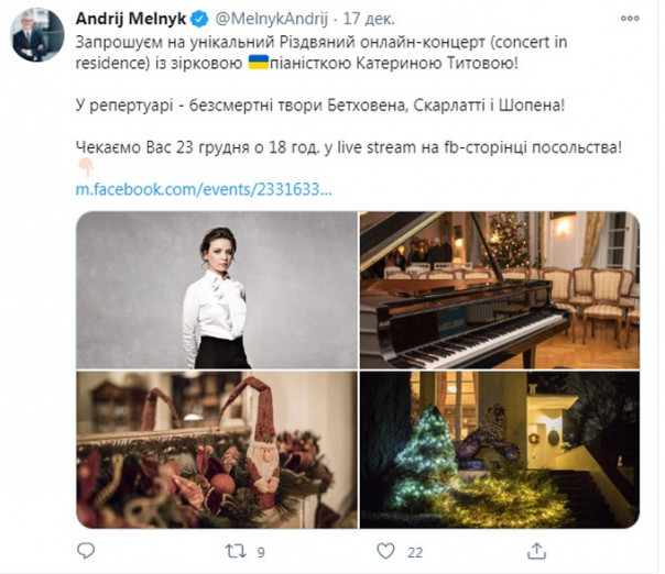 «Приглашаем на уникальный рождественский онлайн-концерт (concert in residence) со звёздной пианисткой Екатериной Титовой! В репертуаре – бессмертные произведения Бетховена, Скарлатти и Шопена! Ждём вас 23 декабря онлайн на странице посольства фейсбук», - сообщал в своём микроблоге твиттер украинский посол в ФРГ Андрей Мельник 17 декабря.