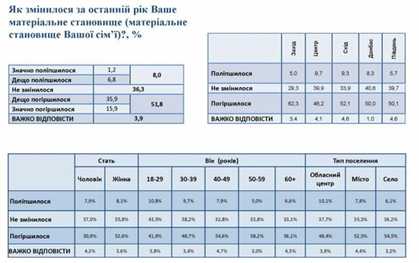 Так, в 2020 году денег стало меньше у 51,8% граждан Украины. У остальных материальное положение или никак не изменилось (36,3%), или даже улучшилось (8%).