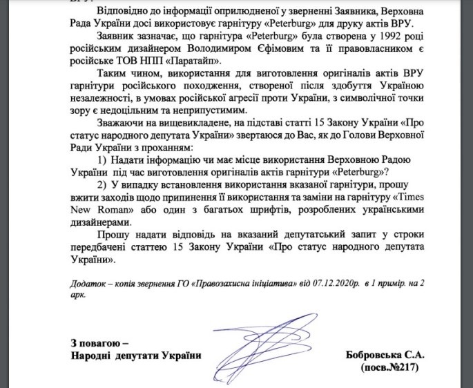 «Согласно информации, обнародованной в обращение заявителя, Верховная Рада Украины до сих пор использует гарнитуру "Peterburg" для печати актов ВРУ. Заявитель отмечает, что гарнитура "Peterburg" была создана в 1992 году российским дизайнером Владимиром Ефимовым, и ее правообладателем является российское ООО НПП "Паратайп"», — отмечается в запросе Бобровской.