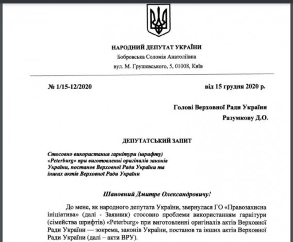 Нардеп заявила, что к ней обратилась общественная организация «Правозащитная инициатива» — «касательно проблемы использования гарнитуры (семейства шрифтов) "Peterburg" при изготовлении оригиналов актов Верховной Рады Украины».