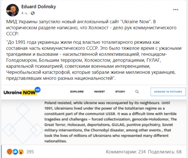 «МИД Украины запустило новый англоязычный сайт "Ukraine Now". В историческом разделе написано, что Холокост - дело рук коммунистического СССР: