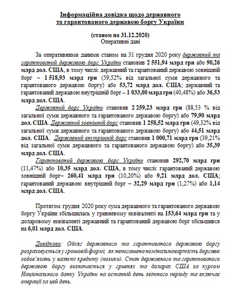 На 31 декабря 2020 года сумма государственного и гарантированного государством долга Украины увеличилась в гривневом эквиваленте на 153,64 млрд гривен, в долларовом — на $6,01 млрд.