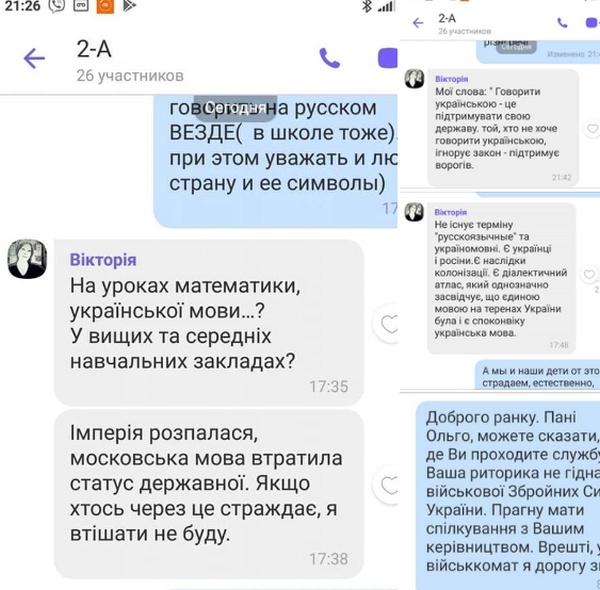 Более того учитель начала угрожать доносом матери одного из учеников, работающей в Вооруженных силах Украины (ВСУ), за ее позицию по языковому вопросу. Она пообещала добиться увольнения военнослужащей за ее «негодную риторику».