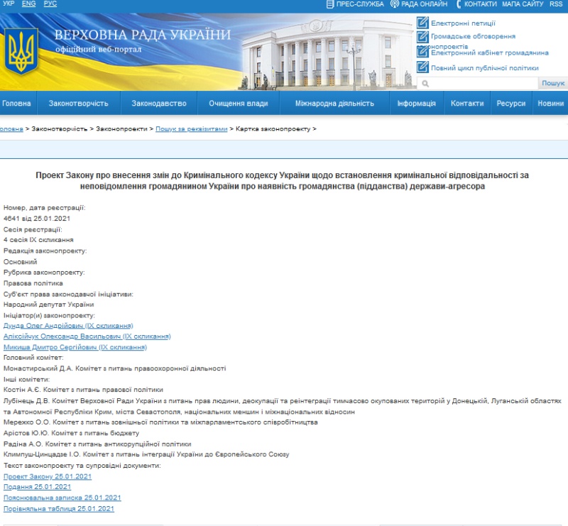 В другом законопроекте №4640 предлагается внедрить административную и уголовную ответственность за сокрытие украинцами гражданства «страны-агрессора» — Российской Федерации, а также предусматривает механизм лишения таких украинцев права голоса на выборах и возможности занимать государственные должности или баллотирования в депутаты.