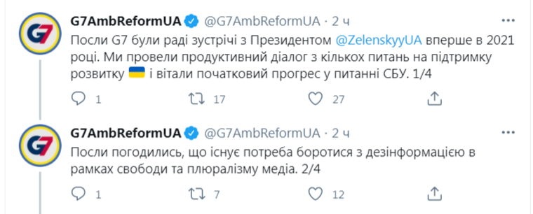 Послы стран «Большой семерки» (G7) во время встречи с президентом Украины Владимиром Зеленским поддержали закрытие украинской властью оппозиционных телеканалов «112-Украина», NewsOne и ZIK.