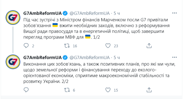 «Во время встречи с министром финансов Марченко послы G7 приветствовали обязательства Украины принять необходимые меры, включая реформирование Высшего совета правосудия и в энергетической политике, чтобы завершить пересмотр программы МВФ для Украины», — отметили послы.