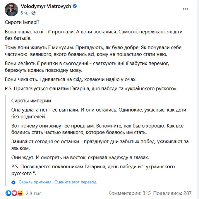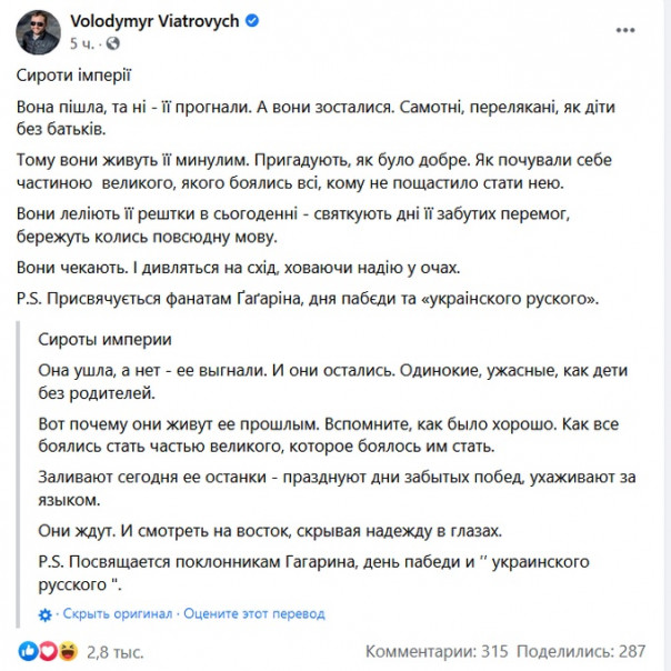 В конце Вятрович уточнил, что пост посвящается отмечающим День космонавтики и День Победы, а также фанатам «украинского русского».