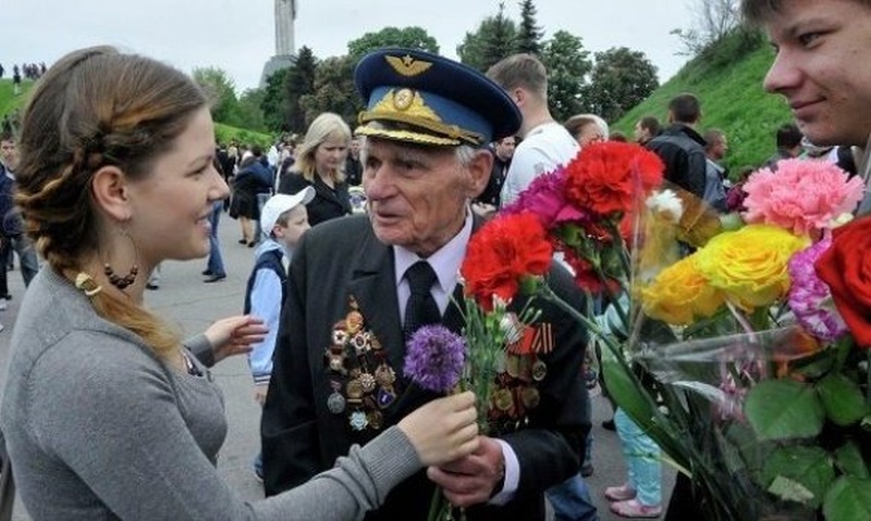 Киевляне, не обращая на радикалов внимание, с 8 утра несут цветы к Вечному огню по случаю праздника Дня Победы.