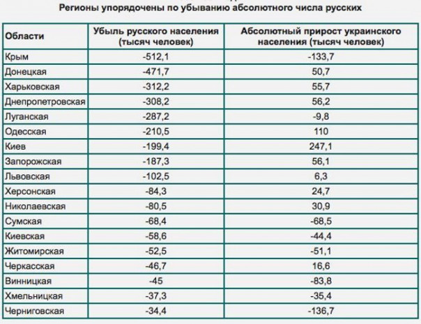 Кстати, Крым по переписи 2001 лишился более чем полумиллиона русских при абсолютной убыли населения 30 тысяч человек. Никакой «сменой идентификации» эти потери не объяснить: невозможно представить, что жители Севастополя, Керчи, Феодосии и Симферополя в массовом порядке потребовали записать их в украинцы.