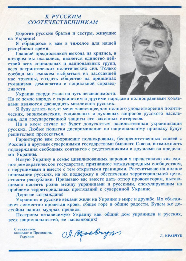 Проект «независимой Украины», созданный в процессе разрушения СССР, несмотря на сладкие обращения первого президента Леонида Кравчука «к русским соотечественникам», которых он называл «полноправными хозяевами» и которым обещал «ни в коем случае» не допустить «насильственной украинизации», задумывался в отрыве от России. Не могло быть никаких «русских соотечественников» и тем более «полноправных хозяев» – только «титульная нация», одна-единственная.