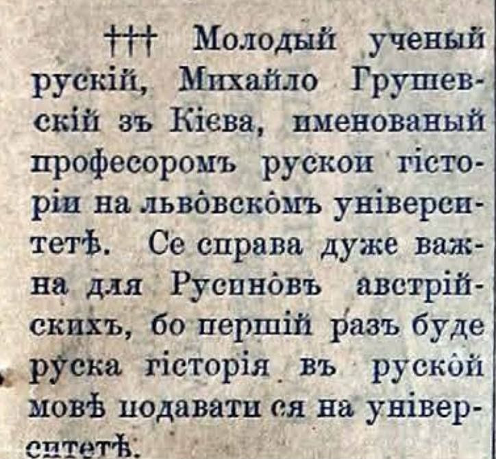 Туго насаждение украинство шло и в городах. Вот как в 1894 году представлялось львовянам назначение украинофила Грушевского: «русский учёный», «профессор русской истории», «преподающий на русском языке» «для русинов».