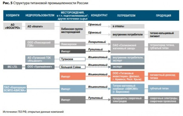 Российское ПАО «Корпорация ВСМПО-АВИСМА» является крупнейшим в мире производителем титана. Его клиентами выступают такие двигателе- и авиастроительные компании, как Boeing и Airbus, например. В России титановая продукция используется в основном в авиакосмической промышленности (около 60%), судостроении и строительстве нефтегазовых платформ (16%). Также титан применяют в машиностроении, цветной металлургии, химической промышленности и медицине. Все сырье для производства титана «ВСМПО-АВИСМА» импортирует с Украины.