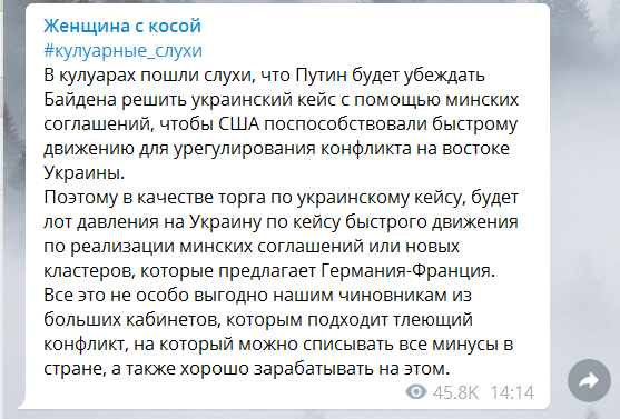 «В кулуарах пошли слухи, что Путин будет убеждать Байдена решить украинский кейс с помощью Минских соглашений, чтобы США поспособствовали быстрому движению для урегулирования конфликта на востоке Украины. Поэтому в качестве торга по украинскому кейсу, будет лот давления на Украину по кейсу быстрого движения по реализации Минских соглашений или новых кластеров, которые предлагает Германия-Франция. Все это не особо выгодно нашим чиновникам из больших кабинетов, которым подходит тлеющий конфликт, на который можно списывать все минусы в стране, а также хорошо зарабатывать на этом», - пишет «Женщина с косой».