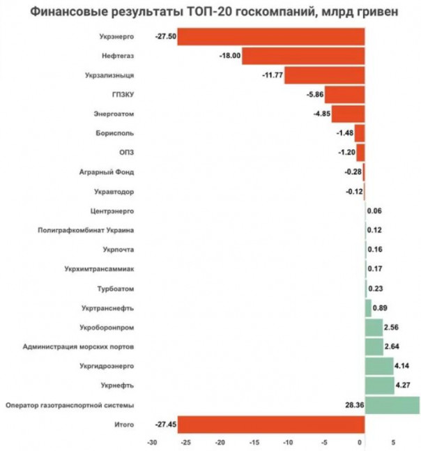 Суммарный убыток 20 крупнейших украинских госкомпаний в 2020 году составляет 27,45 млрд гривен. В тройке антилидеров «Укрэнерго», «Нафтогаз Украины», который почти в два раза увеличил расходы на зарплаты и премии для членов правления компании, и «Укрзализныця». Потери каждой превысили 10 млрд гривен.