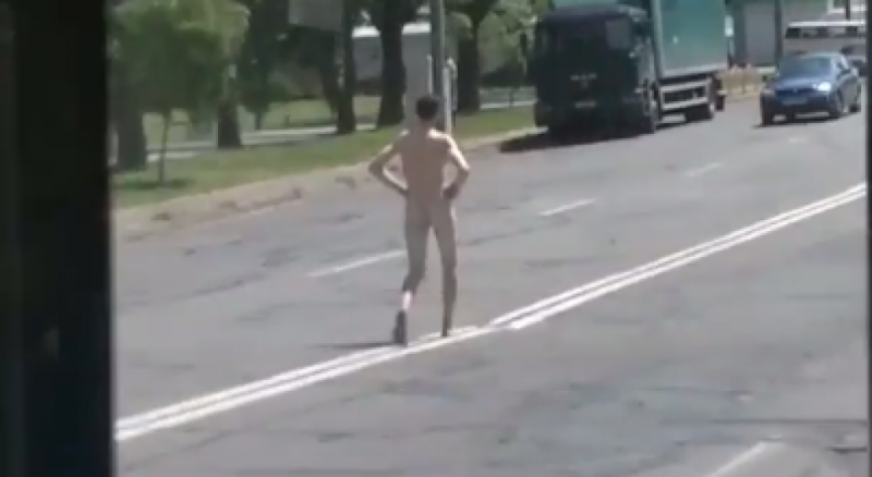 В Киеве пассажиры автобуса засняли на видео голого мужчину, прогуливающегося среди бела дня по проезжей части на одной из улиц спального района Троещина.