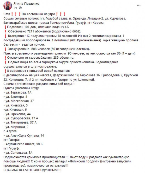 По информации главы ялтинской администрации Янины Павленко, в самой Ялте вода сошла с улиц ближе к вечеру 18 июня. Оставалась сложной обстановка в поселке Кореиз, который входит в состав Ялты, где находится одна из крымских достопримечательностей — Юсуповский дворец. Источник