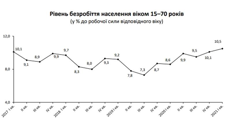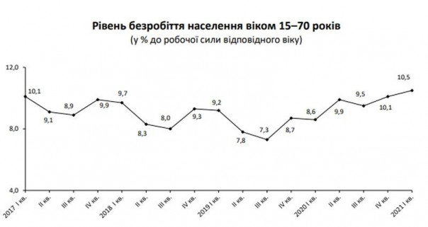 В апреле НБУ ухудшил прогноз уровня безработицы на Украине по методологии Международной организации труда. Прогноз на 2021 год ухудшен до 9,1% по сравнению с 8,8%, которые ожидались в январе.