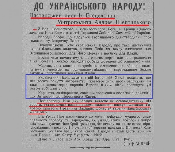 Речь о том, что 30 июня 1941 года Львов был занят гитлеровскими войсками. Это ознаменовалось не только погромами в исполнении духовных чад украинской унии, но и «Актом восстановления украинской державы», в котором звучало славословие фюреру: