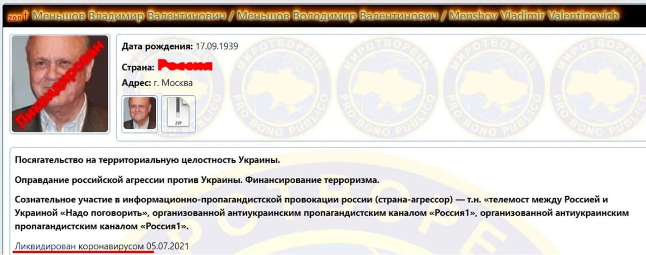 Одним из первых о смерти артиста сообщил скандальный сайт «Миротворец» — на его портрете появилась надпись «ликвидирован».