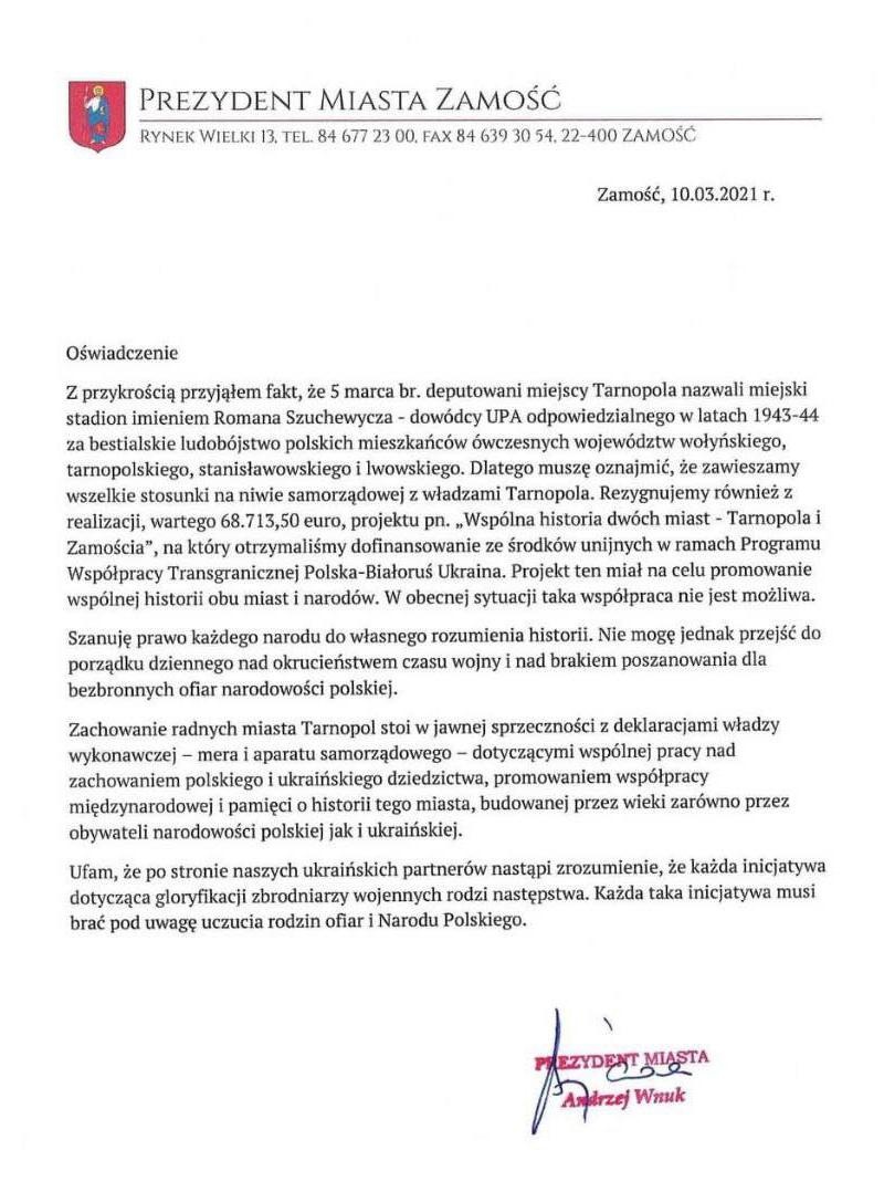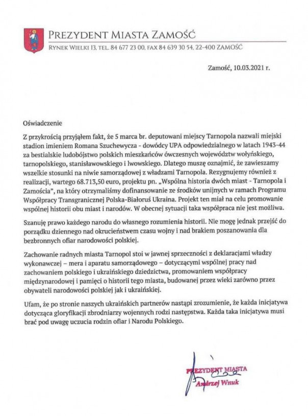 Место проведения конференции особенно интересно. В марте текущего года мэр Замостья Анджей Внук разорвал сотрудничество с украинским городом Тернополем в рамках программы ЕС по приграничному сотрудничеству после того, как Тернопольский горсовет присвоил местному стадиону имя одного из главарей УПА Романа Шухевича, ответственного за уничтожение поляков на Волыни.