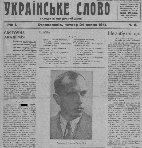 Современные бандеровцы доказывают, что Бандера не сотрудничал с нацистами и чуть ли не является "жертвой нацистского режима". А вот пожалуйста: газета "Украйынськэ слово" за 24 июля 1941 г. Заметьте, все газеты на оккупированных территориях издавались геббельсовскими отделами пропаганды под жесткой военной цензурой. И - ба! - чей это портрет у нас на первой странице?