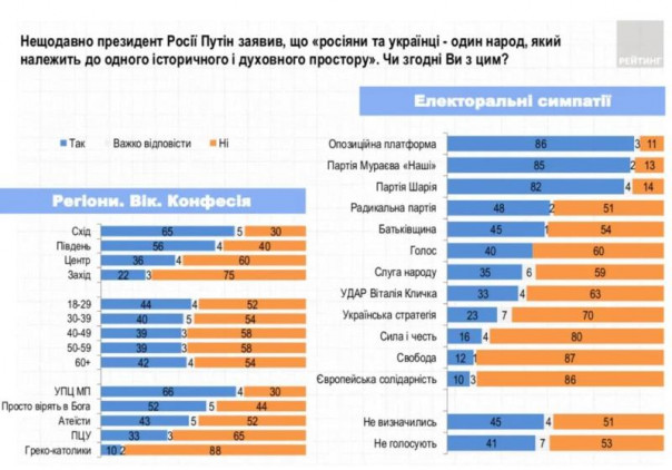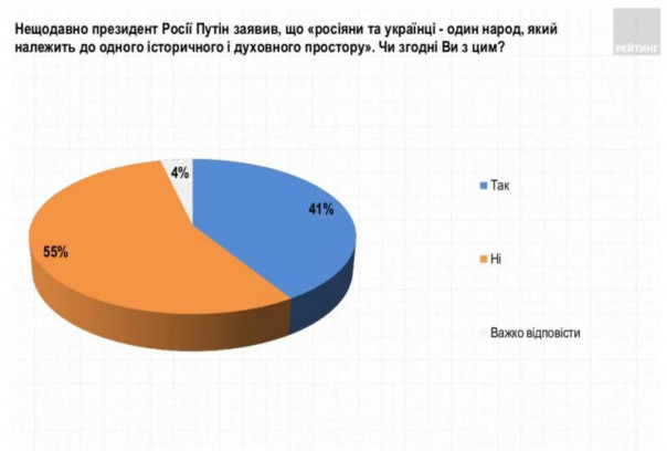 Украинская социологическая группа «Рейтинг» после публикации статьи президента РФ Владимира Путина об историческом единстве русских и украинцев провела соцопрос, в котором жителей страны спросили: «Считают ли они себя и русских одним народом, принадлежащим единому историческому и духовному пространству».