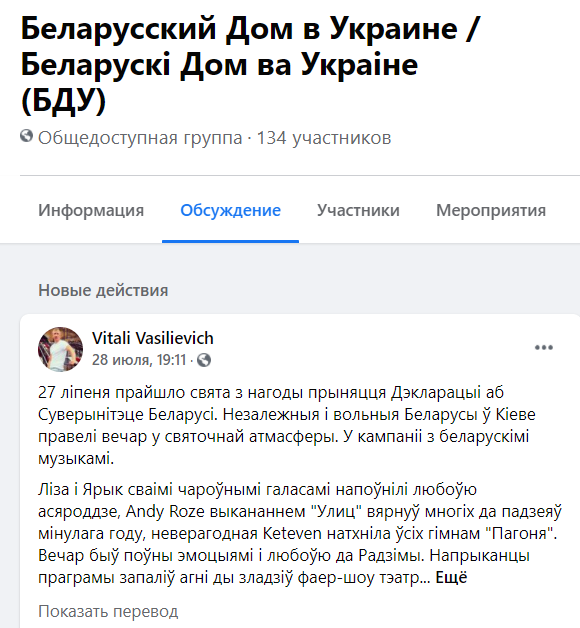Группа в Facebook "Белорусский дом", которую вел Шишов (ник - Виталий Васильевич), насчитывала всего 134 подписчика. Последнее сообщение там - как белорусы Киева отметили день независимости свой родины.