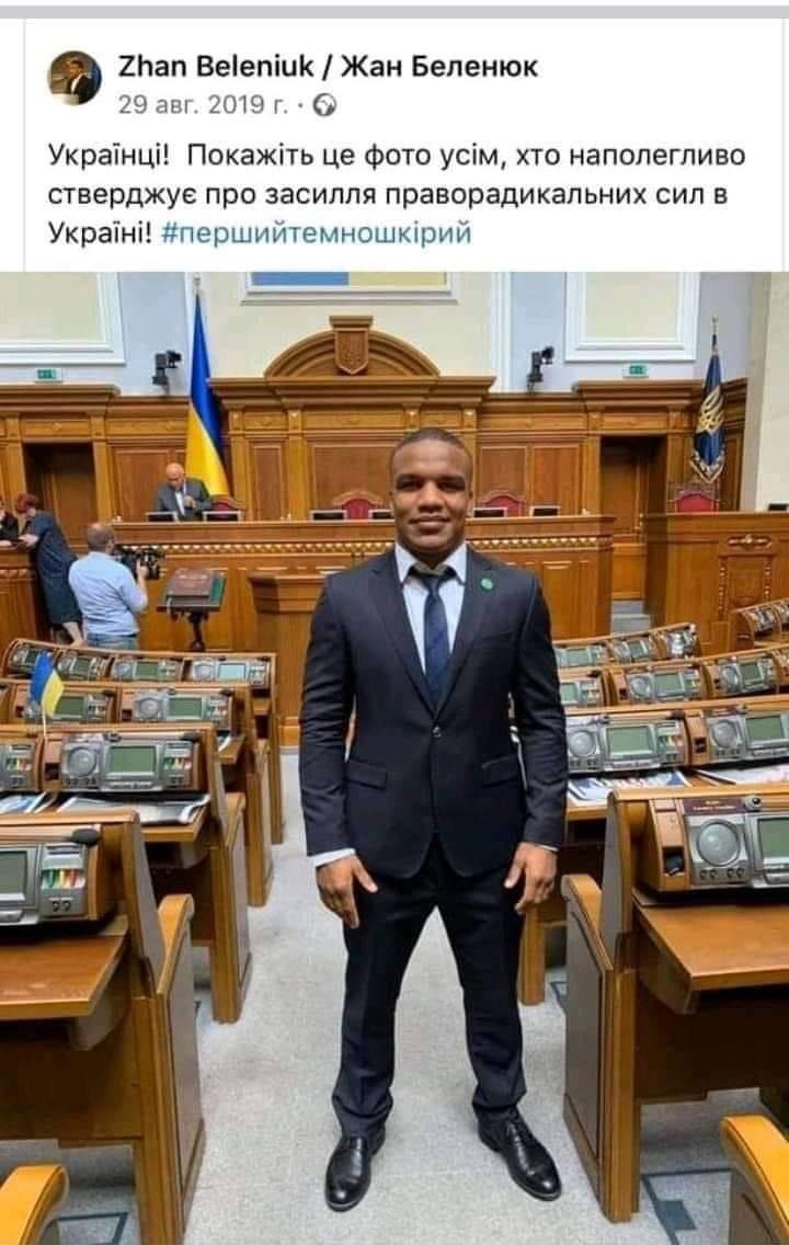 Пока все логично и разумно: почему в столице вроде бы «европейского» и как бы «демократического» государства происходят столь возмутительные инциденты. Но здесь начинаются вопросы уже к самому Беленюку, который публично отрицал влияние прорадикальных группировок на Украине — мол, его политическая карьера простого темнокожего парня тому пример. Так, 29 августа 2019 года он выставил на своей странице в ФБ собственную фотографию в зале заседаний Верховной Рады с подписью: «Украинцы! Покажите это фото всем, кто настойчиво рассказывает про засилье праворадикальных сил на Украине!»