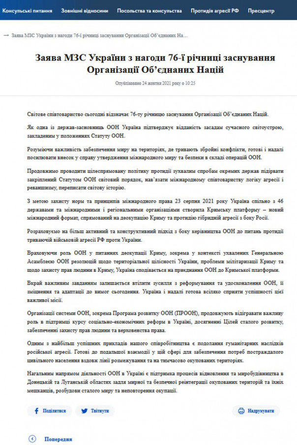 Об этом говорится в заявлении Министерства иностранных дел по случаю 76-й годовщины основания ООН.