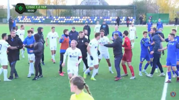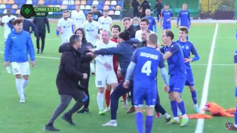 Матч 15-го тура Второй лиги Украины по футболу в группе «Б» между командами «Сумы» и «Перемога» завершился не ударами мячом по воротам, а ударами по голове и распылением слезоточивого газа.