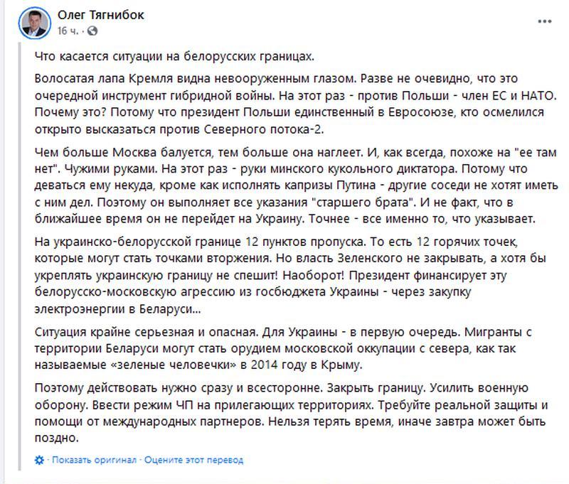 Тягнибок обвинил президента Украины Владимира Зеленского в отсутствии должной реакции на происходящую на польско-белорусской границе ситуацию, а также в том, что он не сделал ничего для усиления контроля на границе с Белоруссией.