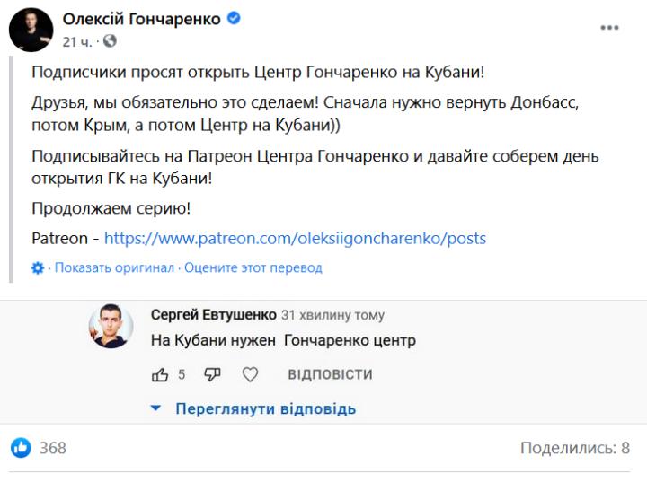 Депутат от партии «Европейская солидарность» Алексей Гончаренко, глава межфракционного объединения «Кубань» заявил, что его просят открыть «Центр Гончаренко» в российском регионе.