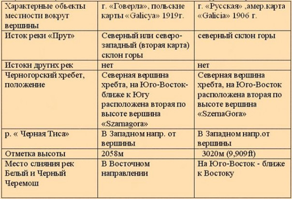 Как видим, положение «Говерлы» и «Русской» по отношению к окружающим особенностям местности совпадают, и бесспорными маркерами является исток реки Прут и положение самой высокой вершины на северном плече Черногорского хребта. Но есть серьёзное различие – высоты этих вершин разнятся почти на 1000 м. Но горных вершин с высотой такого порядка в Восточных Карпатах не существует. Речь идёт об ошибке при наборе пояснительных надписей. Если мы в отметке высоты горы «Русская» на американской карте перевернём первую цифру «9» в числе «9,909 ft», то получим другое число «6,909 ft» = 2106 м, которое близко к 2058 м. Эта незначительная разница вполне понятна – маловероятно полное совпадение значений высот горной вершины на картах, созданных картографическими службами двух разных стран в начале двадцатого века.