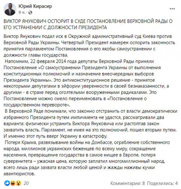 «Четвертый президент намерен оспорить законность принятия парламентом постановления о его якобы самоустранении с должности главы государства. Это антиконституционное решение, принятое некоторыми депутатами в эйфории уверенности в своей безнаказанности, а другими — в страхе перед оголтелыми вооруженными радикалами», — написал Кирасир на своей странице в соцсети.