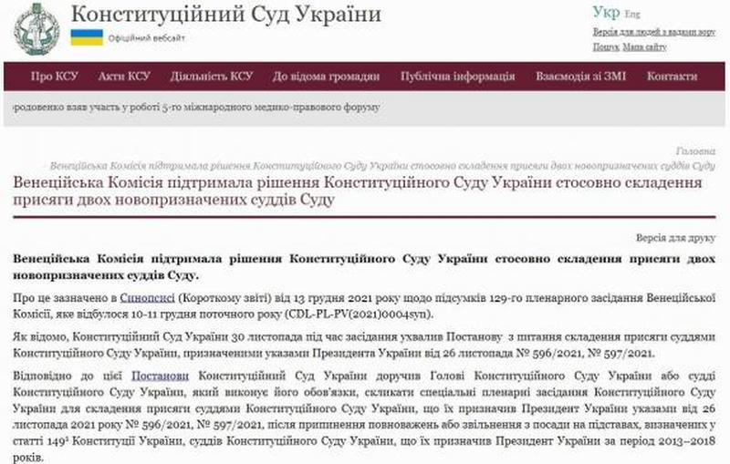 Венецианская комиссия поддержала решение Конституционного суда об отсрочке присяги двух судей, которых 26 ноября президент Украины Зеленский назначил по своей квоте