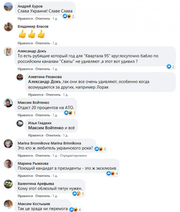«Экс-руководитель националистической партии "Голос" будет обслуживать за 220 тысяч евро российского водочного миллиардера, развлекая его своими песнями. У меня вопрос: а куда делась вся ненависть к русскому? У любой истории есть своя цена. А у украинского национализма эта цена еще всегда и низкая. Все, что нужно знать об этих… идеологически пропитанных людях», — прокомментировал нардеп Илья Кива в своем Telegram-канале.