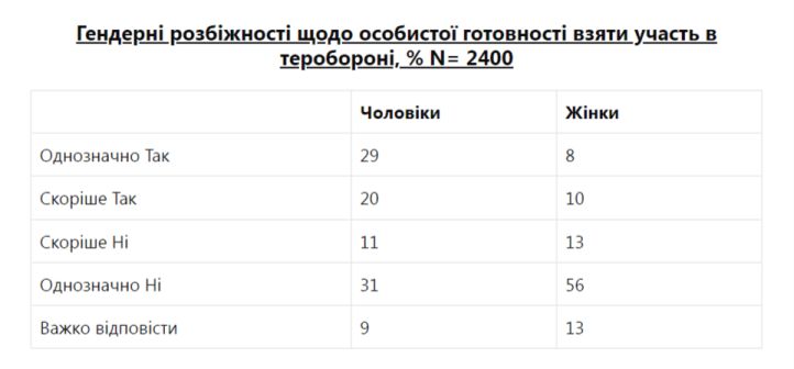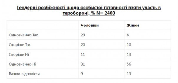 «В ответах мужчин и женщин на этот вопрос зафиксированы определенные разногласия: половина мужчин (50%) поддерживают этот шаг и еще треть против. В то же время среди женщин 40% выступают за создание войск территориальной обороны и 28% – против. Доля тех, кто не определился, среди женщин почти вдвое выше», — отметили в UIF.