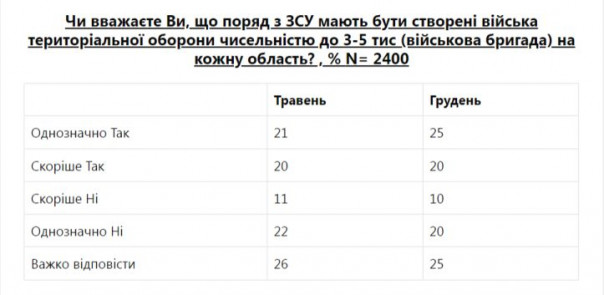 При этом за создание войск территориальной обороны выступает 45% украинцев, а треть против этого.