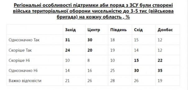 Меньше всего поддерживают или даже выступают против создания войск территориальной обороны — на востоке страны и особенно на Донбассе.
