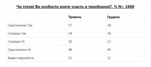 «Большинство респондентов в пределах всей страны ответили, что лично не готовы принять участие в территориальной обороне. Готовы это сделать 32%», — рассказали в UIF и подчеркнули, что настроения относительно готовности лично участвовать в территориальной обороне такие же, как в мае 2021 года.