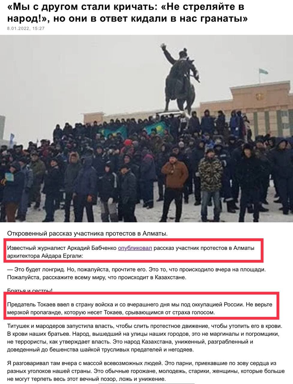 Минутка обжигающей правды: убиенный Аркадий Бабченко публикует откровенный и правдивый рассказ мирного протестующего из Казахстана, который борется против (цитата) «сдачи страны под пяту путинского сапога».